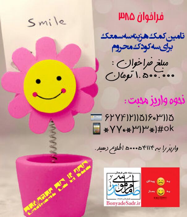 فراخوان 385 بنیاد امام موسی صدر : با هدیه ای دنیای سکوت سه کودک محروم را شادتر کنیم. علیرضا و متین دو دانش آم…