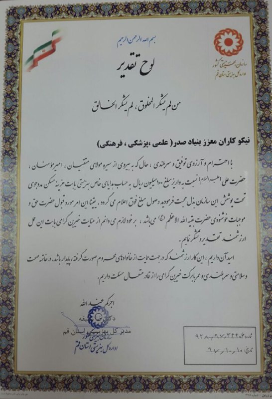 � #گزارش_مالی ۸۱۵ 🦋 #گزارش_اجرایی ۸۱۵ ✍ بهزیستی استان قم برای خیرین بنیاد صدر به دلیل تلاش برای خانه دارشدن مادری با دو فرزند معلول، لوح و پیام تشکر و قدردانی ارسال نمود … هر چند محبت خوبان هیچ گاه جبران شدنی نیست اما این لوح تقدیم همه عزیزانی باد که به فکر رفع مشکل […]