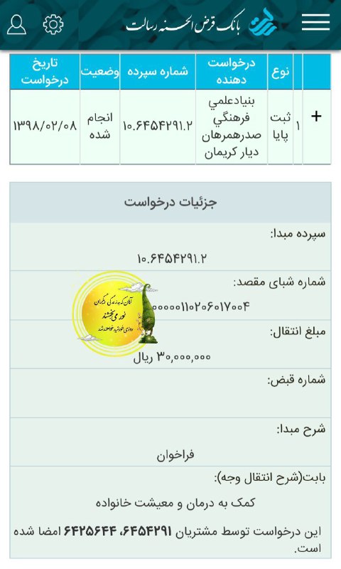 🦋 #گزارش_مالی ۸۶۷ ✍ محبت شما برای معیشت خانواده کارگر باشرافت و نیز درمان خودش واریز شد. ❤️ برای سلامتی اش دعا کنیم… 💟 @BonyadeSadr