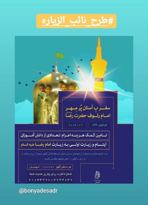 🕋 هوالعزیز 🕋 🦋 #فراخوان ۸۹۹ 📆 ۲۳ تیرماه ۹۸ 🌴 #طرحنائبالزیاره ✍ دلشان پر میزند به شوق حرم ، بچه هایی که محرومیت مشتاق ترشان کرده، بنا داریم آرزوی دانش آموزان زیادی را که شوق زیارت دارند را برآورده کنیم . هر تعداد که توانستیم … دانش اموزانی که یا از نعمت پدر محرومند […]