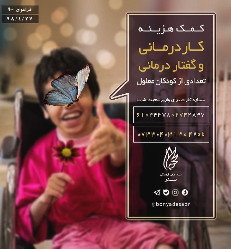 🕋 هوالعزیز 🕋🦋 #فراخوان 900📆 ۲۷ تیرماه ۹۸5⃣نفر دیگر راهم به این کار خیر دعوت کنید. #همه_باهم_میتوانیم ❤️ حمایت از کودکان معلول✨ خداقوت به همه شما خوبان، همه باهم به نهصدمین فراخوان رسیدیم. الحمدلله، خداوند به زندگی همه شما برکت وتوفیق بیشر بدهد.✍ پنج شنبه است و چون هزینه های کار درمانی و گفتار درمانی […]