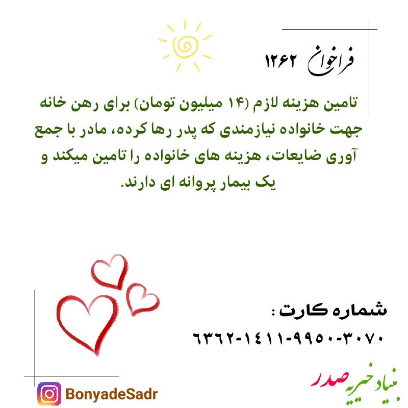 🦋 #فراخوان ۱۲۶۲❤️ سرپناهی برای یک خانواده✍ خانواده ای ٥ نفره که پدر خانواده را رها کرده، و مادر با جمع آوری ضایعات، هزینه های خانواده را تامین میکند. این خانواده که یک فرزند با بیماری پروانه ای نیز دارد، هم اکنون در یک زیرزمین نم زده با شرایط بسیار نامناسب در یزد زندگی میکنند.با […]