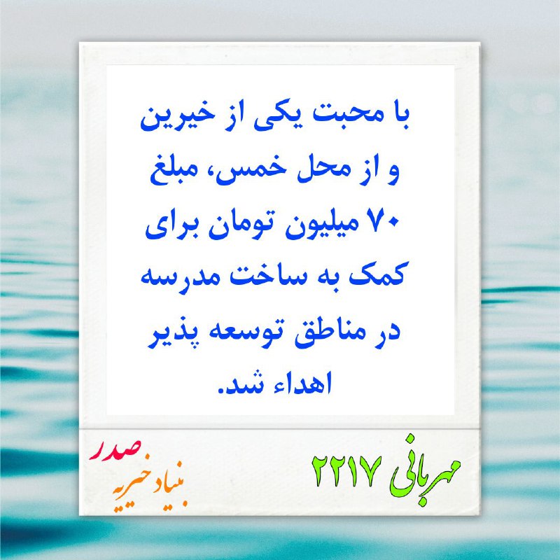 🌸 #مهربانی ۲۲۱۷✍ بنیاد صدر در حال ساخت سی و ششمین مدرسه در مناطق توسعه پذیر میباشد و امید است همه باهم بتوانیم در توسعه زیرساخت های آموزشی و تحقق عدالت کامل آموزشی، موثر باشیم.شما هم میتوانید، خمس خود را به بنیاد اعلام نموده و بنیاد پس از استعلام از مرجع مورد نظر، مبالغ اجازه […]