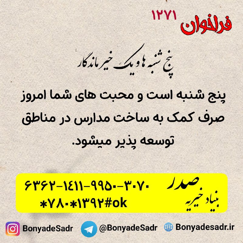 #فراخوان ۱۲۷۱ پنج شنبه ها و یک خیر ماندگار پنج شنبه است، ضمن فاتحه و صلوات برای همه آسمانی ها، محبت های امرو…
