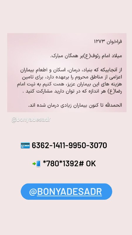 #فراخوان ۱۲۷۳ برای درمان بیماران مناطق محروممیلاد امام رئوف(ع)بر همگان مبارک. از آنجاییکه که بنیاد، درمان، اس…
