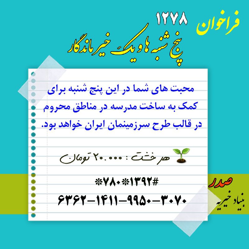 🦋 #فراخوان ۱۲۷۸❤️ پنج شنبه ها و یک خیر ماندگار🕯 باز هم پنج شنبه و قرار عاشقی با آسمانی ها، با ذکر صلوات و دعا و خیرات ✍ به یادشان مدرسه ای بنا کنیم که دعا و لبخند بچه های مناطق محروم؛ همیشه همراهشان باشد … خشت های امروز شما ، آینده سرزمینمان را زیباتر […]