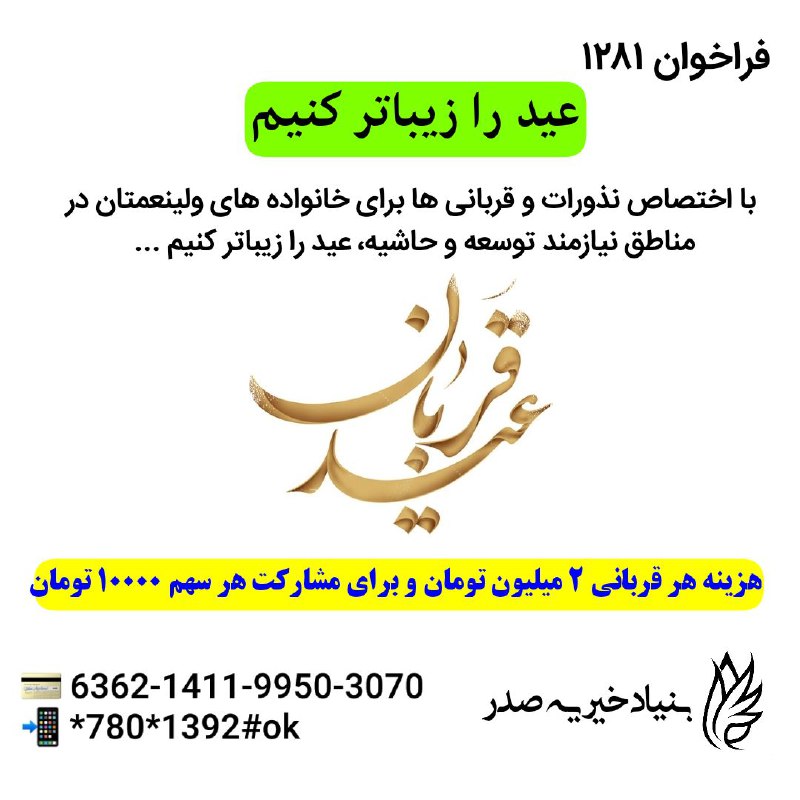 هوالعزیز #فراخوان ۱۲۸۱ ۲۸ تیر ۱۴۰۰ عید قربان را زیباتر کنیم دلهای بخشنده، دمیده شدن نفس حق هستند که مهربانی…