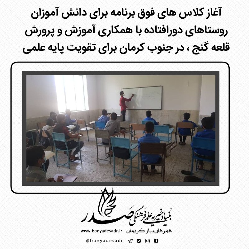 📆 ۹ بهمن ۱۴۰۰ ✍️ دانش آموزانی از روستاهای دورافتاده، که به دلیل نبود زیرساخت ها جهت استفاده از کلاس های آنلاین، متأسفانه آسیب جدی در دوران کرونا دیده اند. با همکاری آموزش و پرورش برای این دانش آموزان خوابگاهی، کلاس های فوق برنامه را در ۴ درس اصلی آغاز نمودیم. BonyadeSadr@