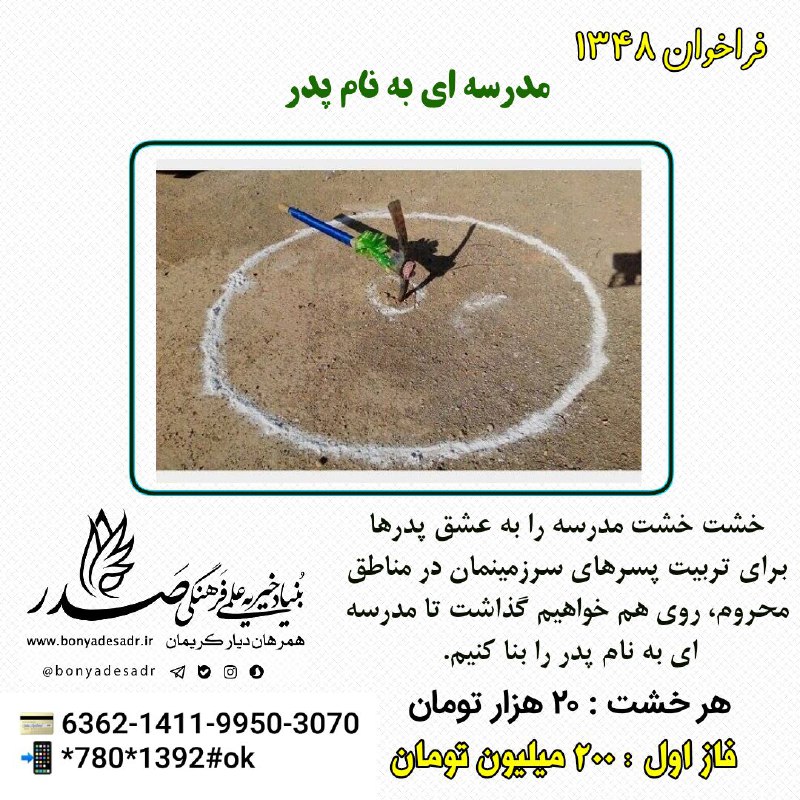 🦋 #فراخوان ۱۳۴۸📆 ۲۵ بهمن ۱۴۰۰🏫 برای دانایی فرزندان سرزمینمان همت کنیم.❤️ به عشق پدر✍ بنا داریم در راستای حمایت از دانش آموزان مستعد مناطق محروم، ساخت مدرسه خیریه شبانه روزی را در جازموریان به نام پدر آغاز نماییم.✍ خشت خشت این مدرسه را به عشق پدرها روی هم خواهیم گذاشت تا باقیات الصالحاتی به […]
