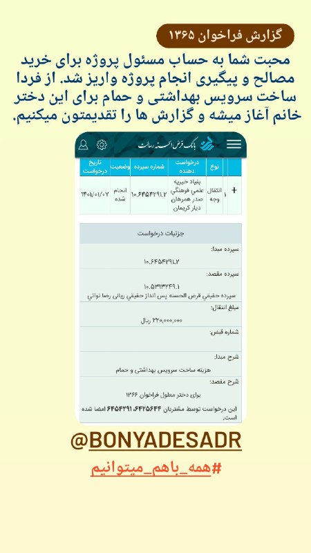 📆 ۷ فروردین ۱۴۰۱ سنگ تمام همه خوبان و همرهان برای دختر قصه ما به لطف خدا و محبت همه خوبان، مبلغ 22,000,000 تومان لازم برای ساخت سرویس بهداشتی و حمام برای دختر معلول اهل رمشک تأمین شد. صلوات مورد نیاز : 22,000,000 تومان کل: 1100 سهم 20,000 تومانی تأمین شده : 1100 سهم ⏳ […]